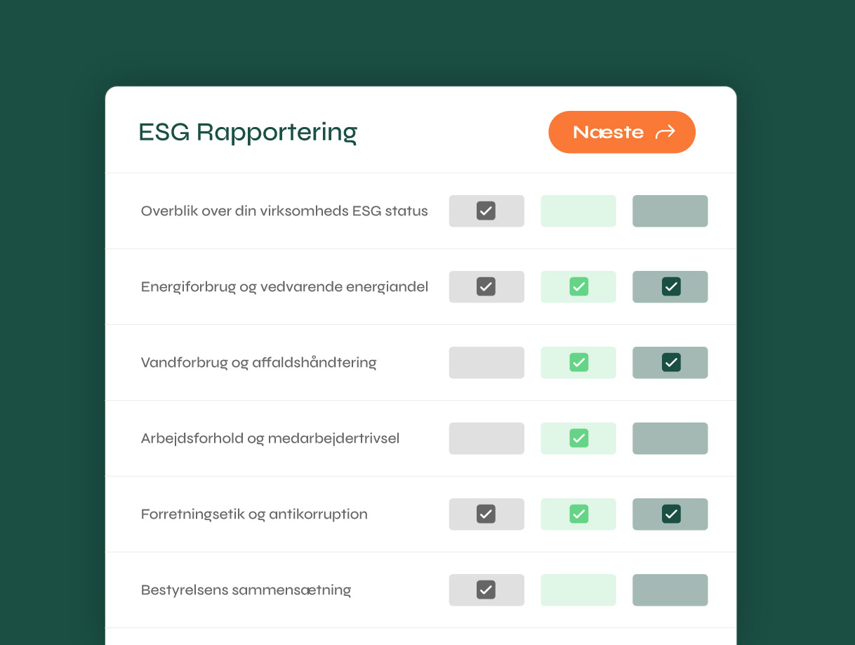 Professionel ESG-rapportering er din konkurrencefordel i B2B-tilbudsprocesser og forhandlinger om finansiering. Vi bistår dig i implementering af strukturerede dataindsamlingsprocesser og identificerer branchespecifikke KPI’er til dokumentation af dine løbende forbedringer.